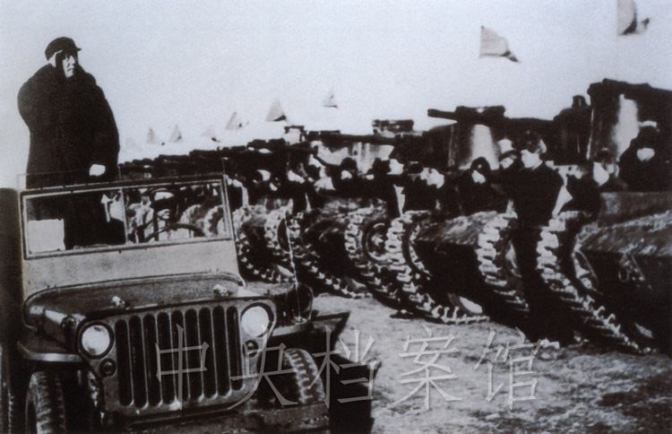 紀錄片:(群眾呼聲)中國人民萬歲!(紀錄片解說)檢閱開始了。東北野戰(zhàn)軍參謀長劉亞樓將軍,向毛主席報告受檢閱的部隊全部到齊。坦克塔上飄揚著紅旗,坦克手精神百倍,向著自己的領(lǐng)袖敬禮。